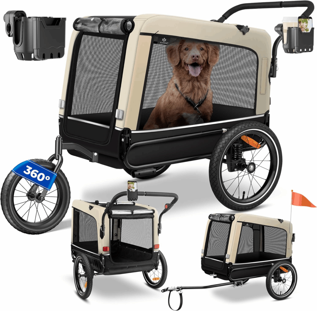 La poussette remorque pour chien est à 122 € au lieu de 137 €, soit 11 % de réduction. Les avis sont bons avec une note de 4,2/5 sur plus de 800 avis clients. Ce modèle est ultra pratique car il s’utilise aussi bien à pied qu’en vélo. La marque KESSER® propose des modèles qui sont parmi les meilleures de remorques de vélo pour chien !