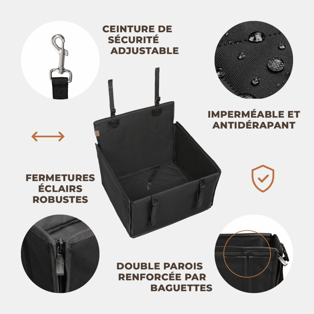 Encore mieux qu’un couchage, le siège auto pour chien peut être fixé dans votre voiture. Souvent muni d’une ceinture, il est idéal pour la sécurité et éviter que votre chien halète en voiture.