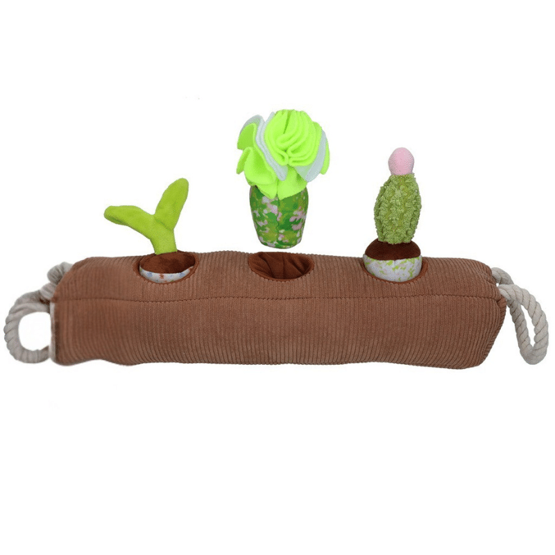 Trop mignon cette peluche de fouille pour chien en forme de buche avec des petites plantes vertes !