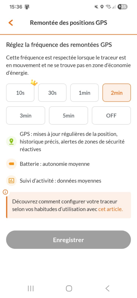 Certains modèles comme le Weenect XT proposent un mode économie d’énergie qui réduit la fréquence des mises à jour GPS pour prolonger l’autonomie. Vous pouvez régler la fréquence des remontées GPS de 10 secondes à 5 minutes.