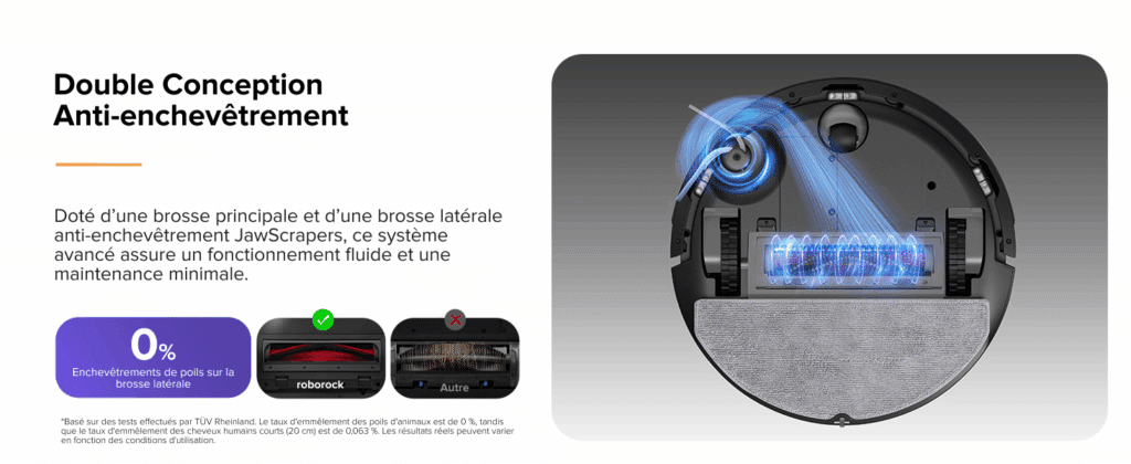 Le roborock Q10 S5+ est un petit bijou doté d’une aspiration ultra puissante de 10 000 Pa. Il est efficace pour ramasser la poussière, la terre, les miettes, les restes de nourritures des enfants et les poils d’animaux, aussi bien sur le carrelage que sur les tapis !